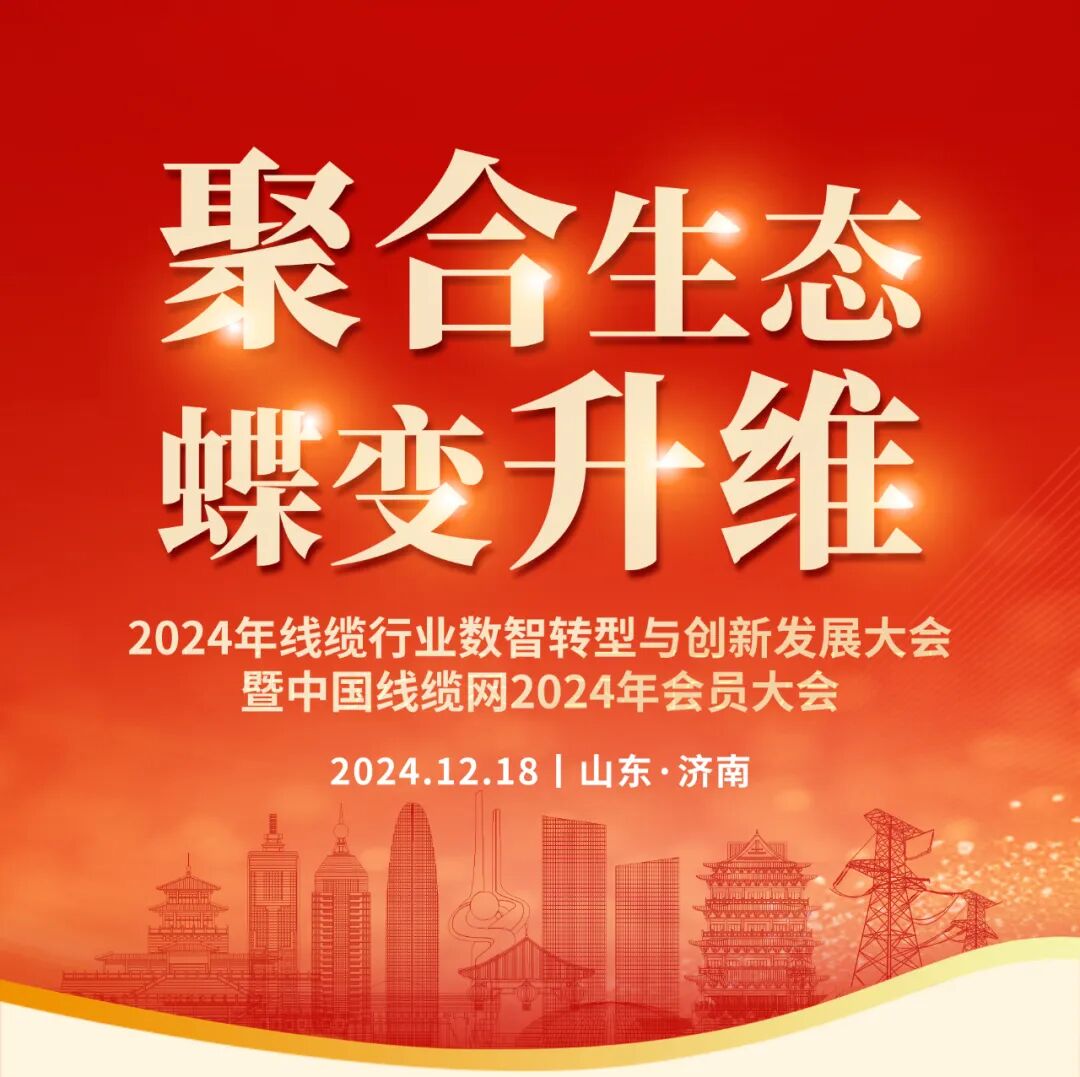 为认真贯彻落实党的二十大精神,促进我国电线电缆行业高质量发展,进一步做大产业规模、提升产业质态,推动行业经济发展,中国线缆网将于12月18日至19日在山东·济南中海凯骊酒店举行2024年线缆行业数智转型与创新发展大会暨中国线缆网2024年会员大会活动。 会议规模300人+ 组织机构 01 主办单位 中国线缆网 02 协办单位 山东省电线电缆行业协会 03 支持单位 安徽省电线电缆行业协会、安徽省无为市电线电缆行业协会、沧州市电线电缆商会、东莞市虎门信息传输线缆协会、广东省电线电缆行业协会、贵州省电线电缆行业协会、河北省电线电缆行业协会、河南省电线电缆行业协会、湖北省电线电缆行业协会、湖南省电线电缆行业协会、江西省电线电缆制造行业协会、晋州市电缆行业协会、辽宁省电线电缆行业协会、宁波市电线电缆商会、宁晋县电线电缆行业协会、上海电线电缆行业协会、深圳市机器人特种线缆行业协会、苏州市光电产业商会、阳谷县光电线缆行业协会、云南省电线电缆行业协会等(注:按首字母排序,排名不分先后) 04 冠名单位 八零三零电工科技有限公司 会议内容 新周期下中国线缆行业的发展趋势 双碳背景下新能源线缆发展新方向 B1级电缆、聚丙烯绝缘电缆等产品的结构设计解析和市场应用 国外市场给电缆行业带来的新发展机遇和经济增长点 电线电缆行业智能化改造、数字化转型及生产成本管控与实践 新材料、新技术、新设备在电线电缆生产中的应用 专家委员会受聘仪式 线缆行业“知名品牌”公布及颁奖典礼